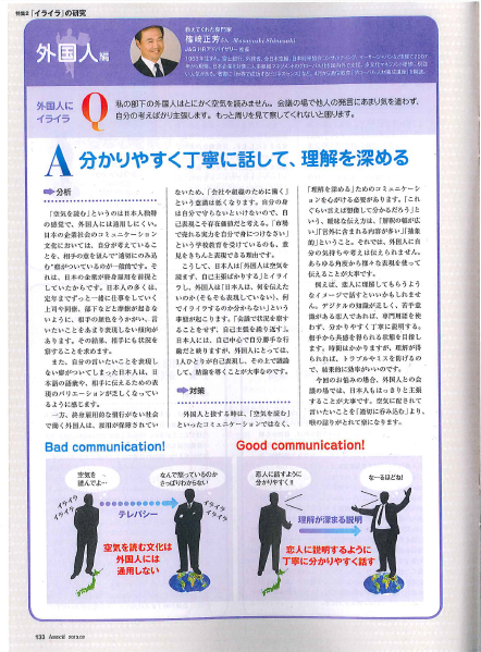 日経ビジネスアソシエ1月10日号(特集2「イライラ」の研究:外国人編)に 弊社代表、篠崎正芳への取材記事が2ページ(133-134)掲載されています。
